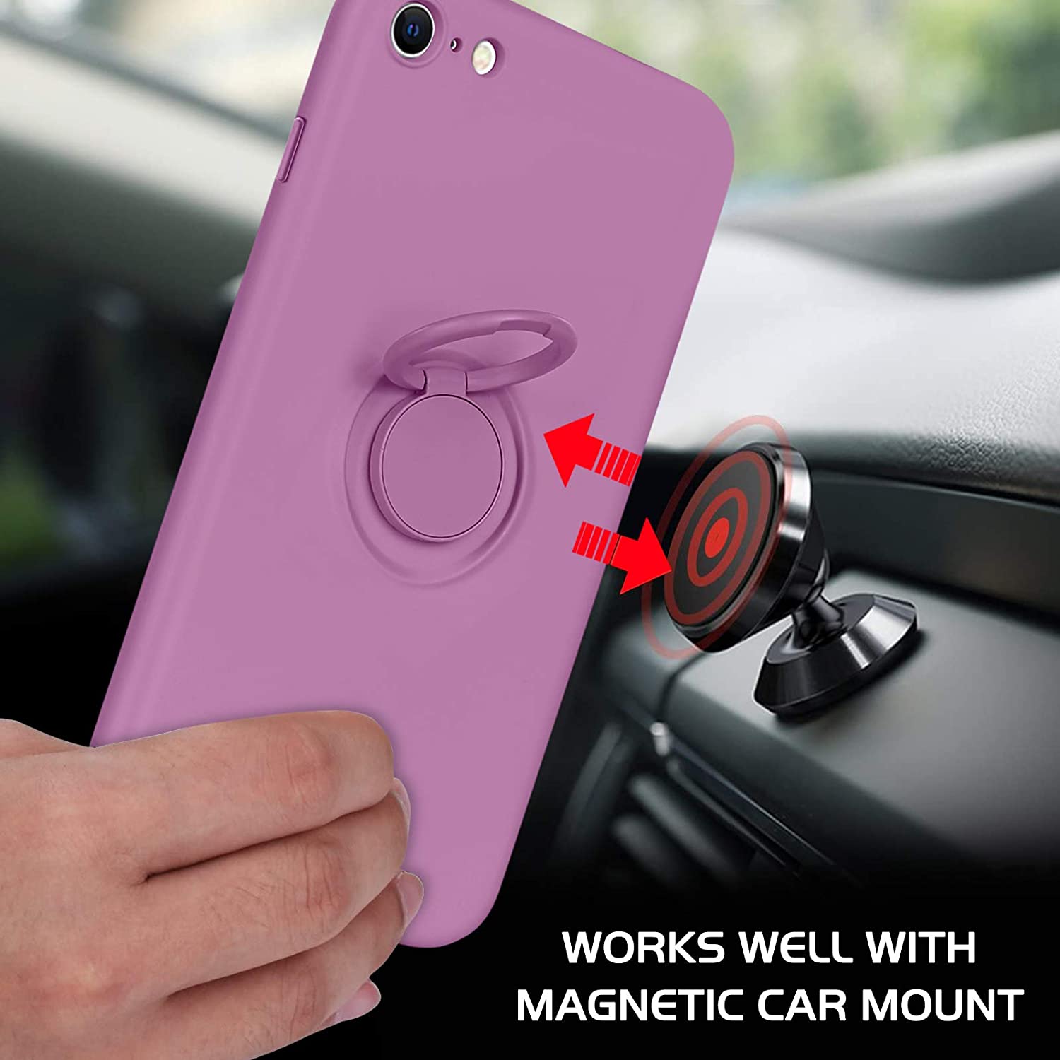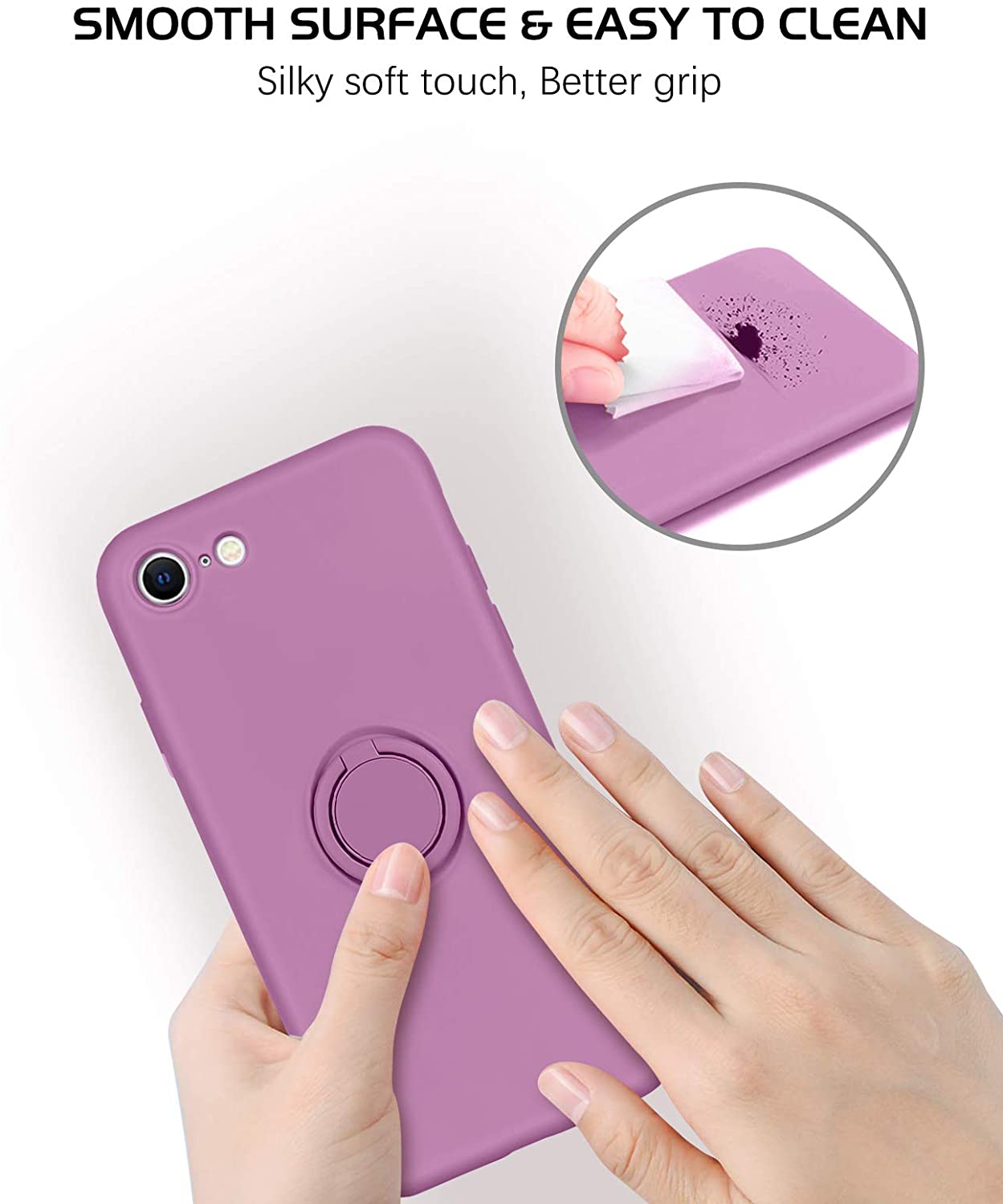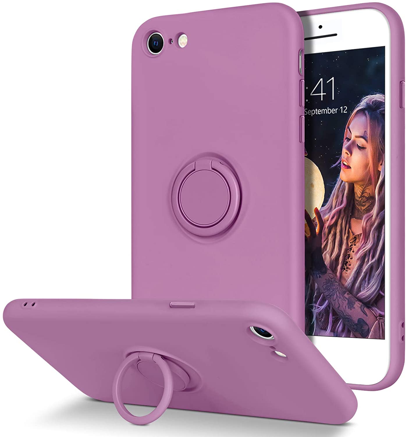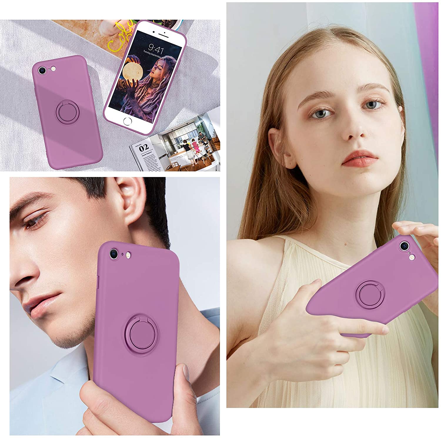 DOMAVER iPhone SE 2020 Case iPhone 8 Case iPhone 7 Case Slim Silicone Soft Gel Rubber Microfiber Lining Cushion Shockproof Protective Cover 360° Ring Holder Kickstand (Support Car Mount), Lilac Purple